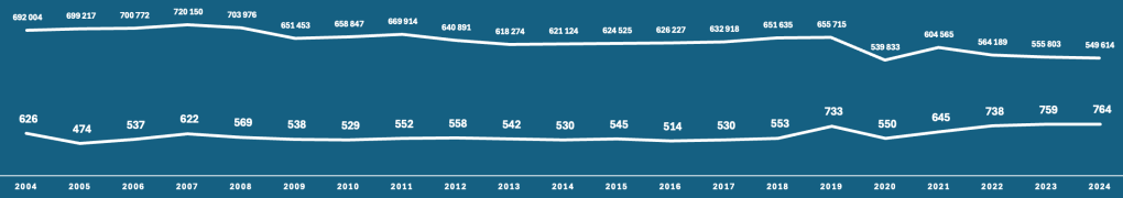 — les fonctionnairesC’est 5 mort·es de plus qu’en 2023 (↗️ 0,66% en 1 an) et 234 de plus qu’en 2014 (↗️ 44,15% en 10 ans).